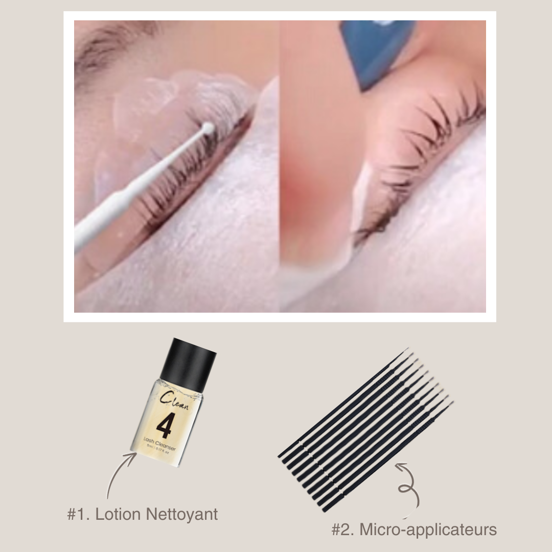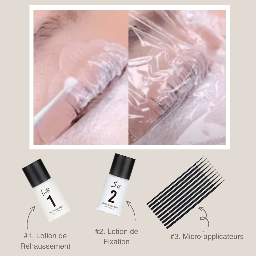 Appliquez la lotion #1 de Réhaussement sur les cils, couvrez de cellophane et laissez agir 5 à 10 minutes. Retirez le surplus avec un coton-tige.